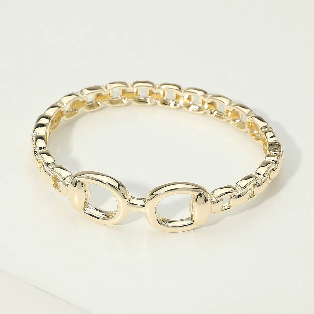 This elegant 14K gold-plated bangle bracelet combines timeless sophistication with practical design. Measuring 0.6" in height and 2.3" in diameter, it offers a refined profile suitable for both everyday wear and special occasions. The interlocking center detail adds visual interest and dimension to the classic bangle silhouette. The hinged closure ensures effortless on-and-off access while maintaining secure wear throughout the day. Crafted with quality gold plating, this piece delivers luxury appeal at an accessible price point, making it an excellent addition to any jewelry collection.