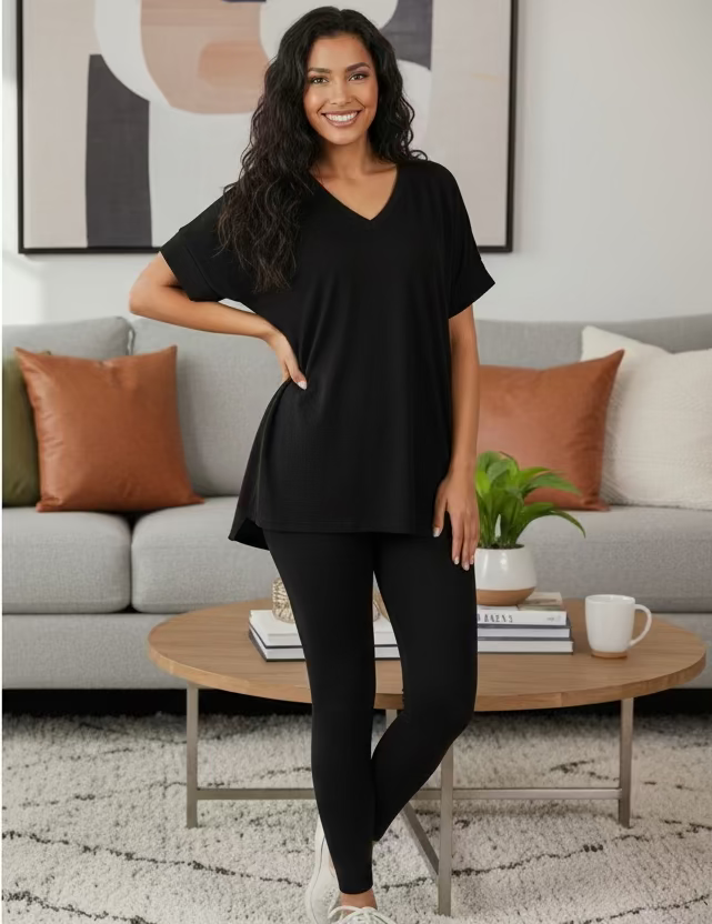 The 2-piece loungewear set is crafted from a brushed dry microfiber blend, consisting of 90% polyester and 10% spandex. This composition ensures optimal softness and comfort, while the perfect stretch and recovery provide an ideal fit. The fabric's performance makes it suitable for both relaxation and light activity.