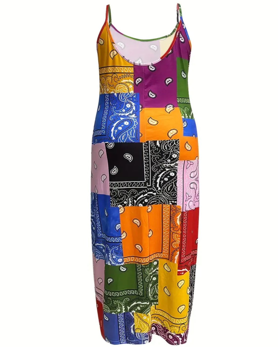 Patchwork print cami dress. Sleeveless maxi dress for spring and summer. Stretchy material.