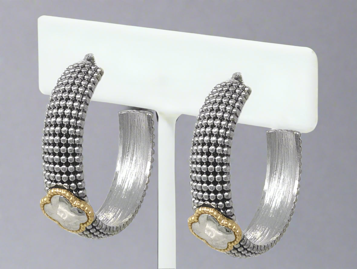 Expertly crafted, the Clover Design Silver Gold Earrings blend silver and gold tones for a sophisticated, versatile look. Their post-back hoop style ensures secure and comfortable wear throughout the day. Perfect for elevating both casual and formal ensembles with subtle elegance.