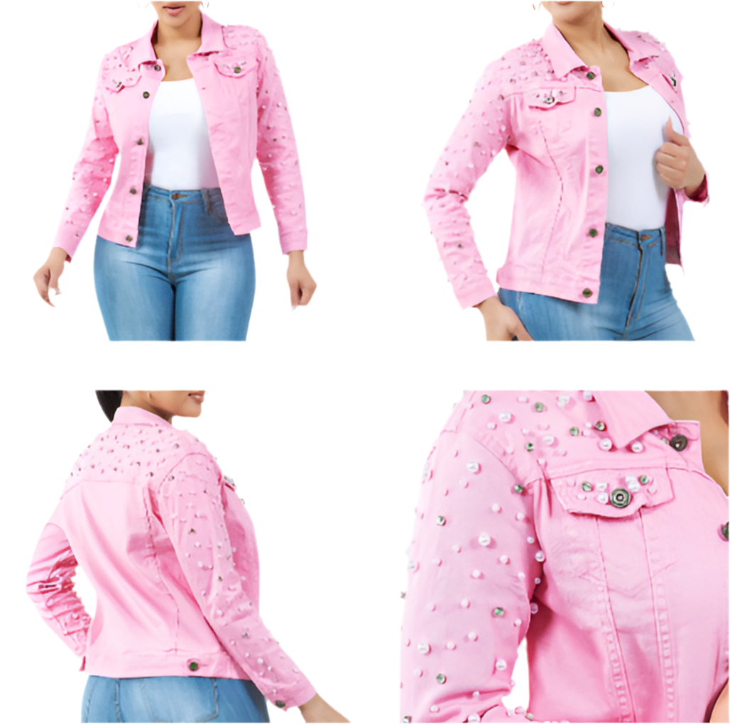 Pink denim jacket with studded Pearl and bling crystal. Slight stretch.