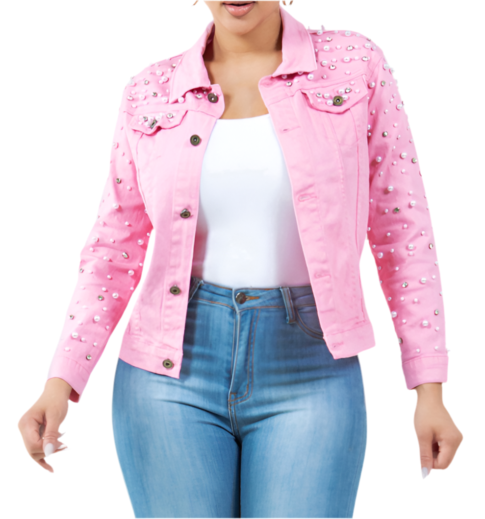 Pink Denim Jacket with Studded Pearl and Bling Crystals L/XL